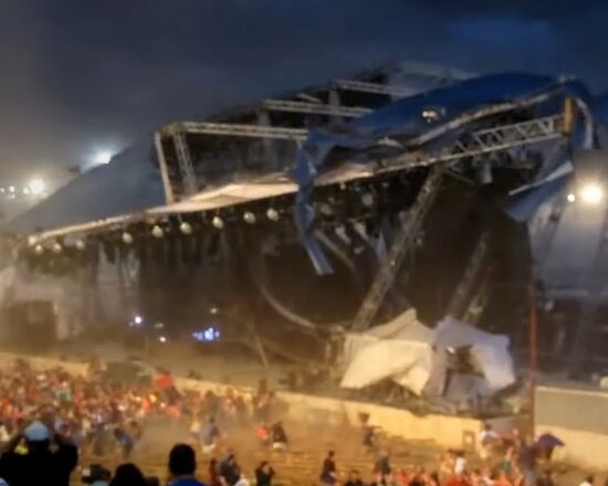 Alors que des intempéries approchaient, le toit de la scène, haut de 19 mètres et faisant partie d'une structure temporaire de 32 tonnes, s'est effondré sous l'effet de vents soudains et violents. En quelques secondes, des poutres d'acier et des câbles de levage se sont abattus sur la foule en contrebas. Sept personnes ont perdu la vie et plus de cent ont été blessées.