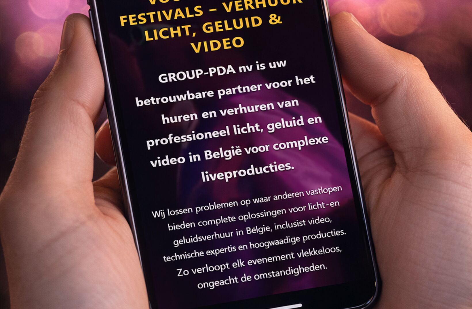 Dans le monde des tournées et des festivals, tout repose sur une impression parfaite. Cela vaut pour nos productions, mais aussi, bien sûr, pour notre propre présentation. Nous sommes fiers de vous présenter notre nouvelle carte de visite numérique : le nouveau site web de GROUP-PDA nv.